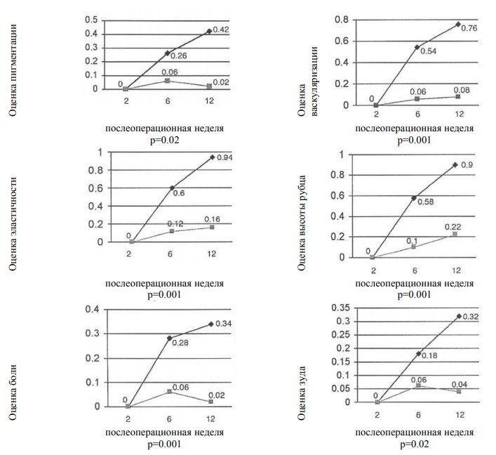 На второй неделе послеоперационного периода во время первой оценки у всех пациентов все послеоперационные рубцы имели нулевую оценку (нормальный). Средние оценки, данные по трем визитам по разным параметрам. В контрольной группе наблюдалось постепенное повышение оценок по всем параметрам. В группе силиконового геля средние оценки пигментации, боли и зуда снижались в период между вторым и третьим визитами. Оценки были несколько выше по параметрам васкуляризации, эластичности и высоты, но все равно намного ниже, чем в контрольной группе.