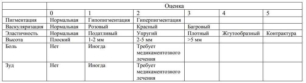 Для регистрации изменений состояния стернальных ран при каждом визите делали снимки цифровой фотокамерой в двух проекциях (фронтальная и боковая). Для исключения фактора субъективности все раны оценивал один и тот же врач (по слепому протоколу). Оценку проводили на второй и шестой неделе, и на третьем месяце послеоперационного периода. Для регистрации данных использовали специальную карту наблюдений. Для проведения исследования была выбрана широко используемая Ванкуверская шкала оценки рубцовых деформаций. Все включенные в исследование раны были максимально возможно стандартизованы по давности, длине разреза, локализации на грудине, типу хирургического вмешательства, шовному материалу и хирургу, осуществлявшему сшивание кожи. Ванкуверская шкала оценки представлена в таблице.
