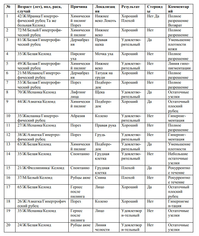Рассасывание было возможным вне зависимости от причины, приведшей к образованию рубца. Не возникало истончения окружающих тканей, развивающегося в случае применения поверхностных кортикостероидных мазей или массивного инъекционного введения кортикостероидов в место повреждения. Также отсутствовали множественные телеангиоэктазии, случающиеся при лечении кортикостероидами. Несколько историй болезни проиллюстрируют курс лечения.